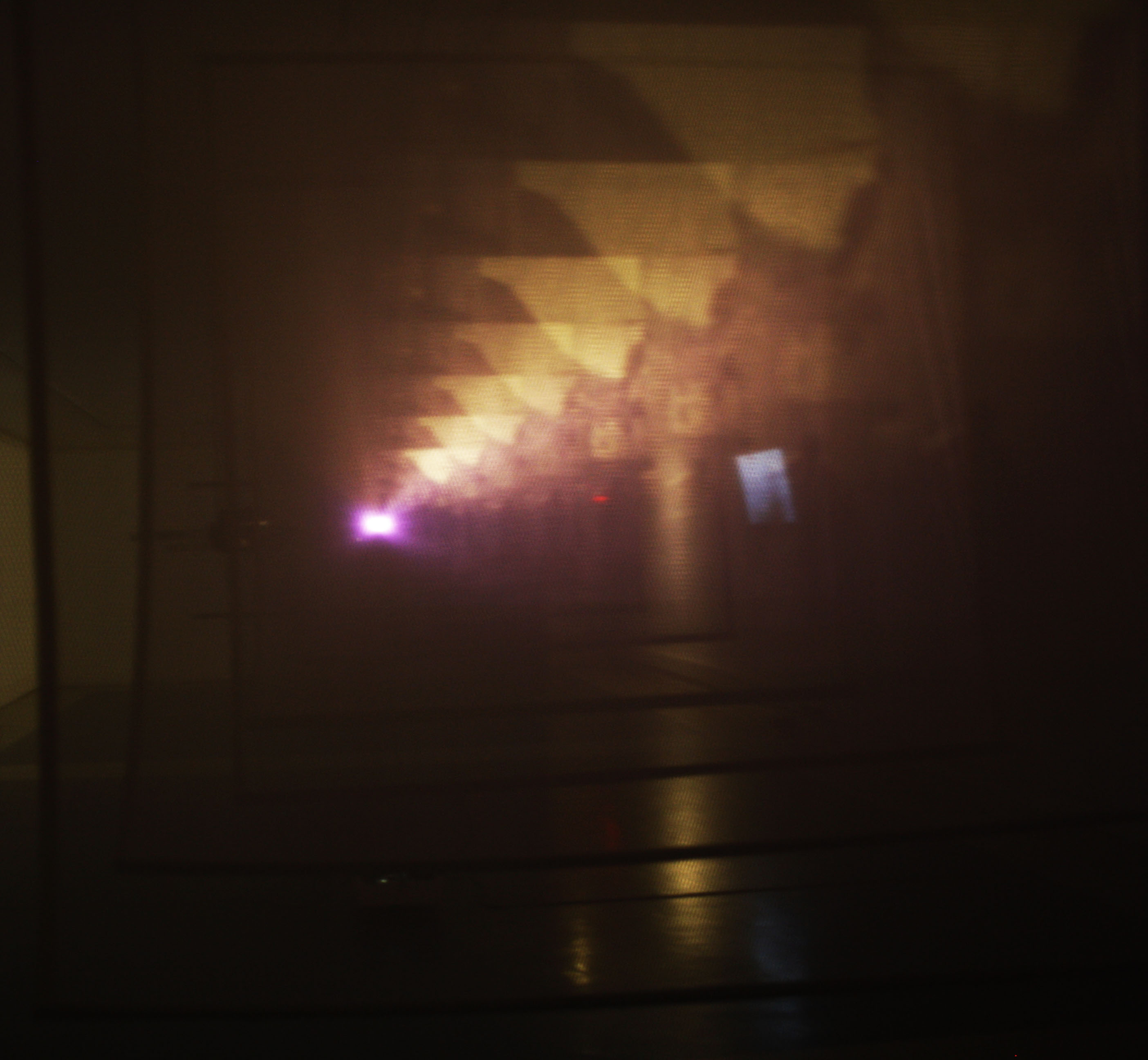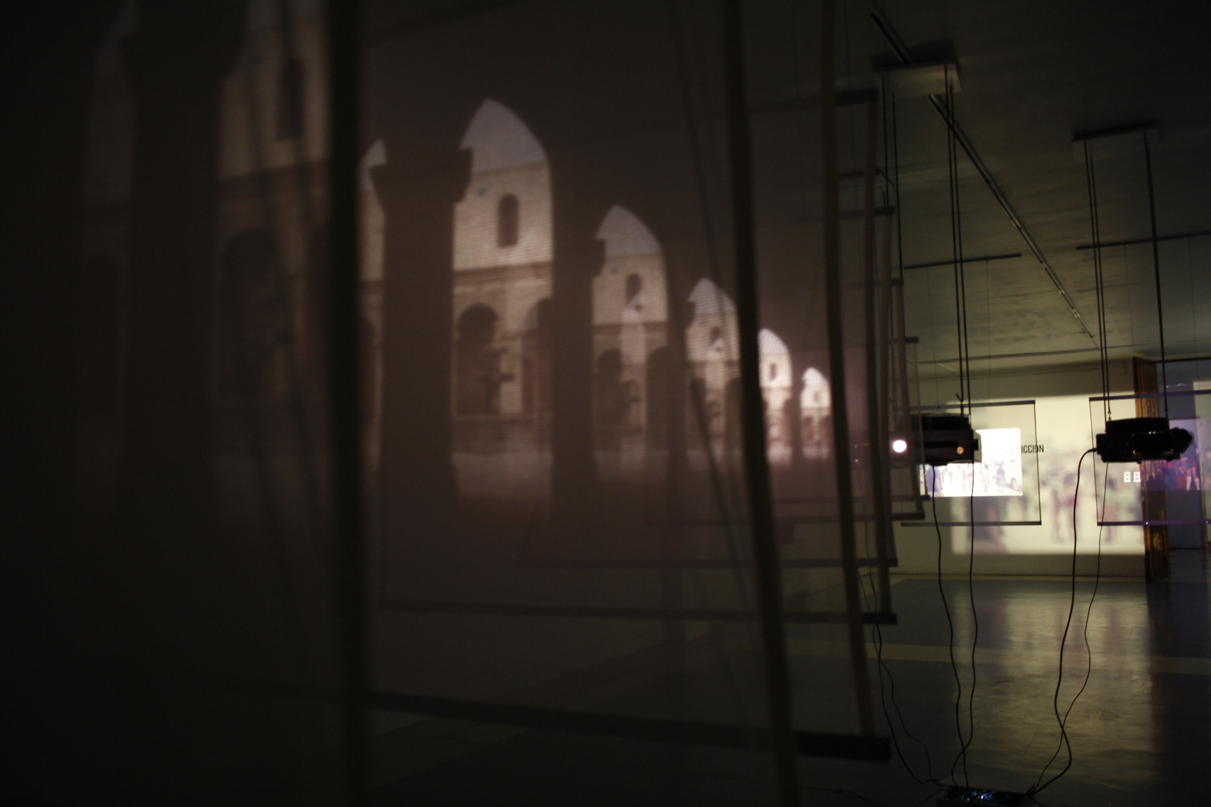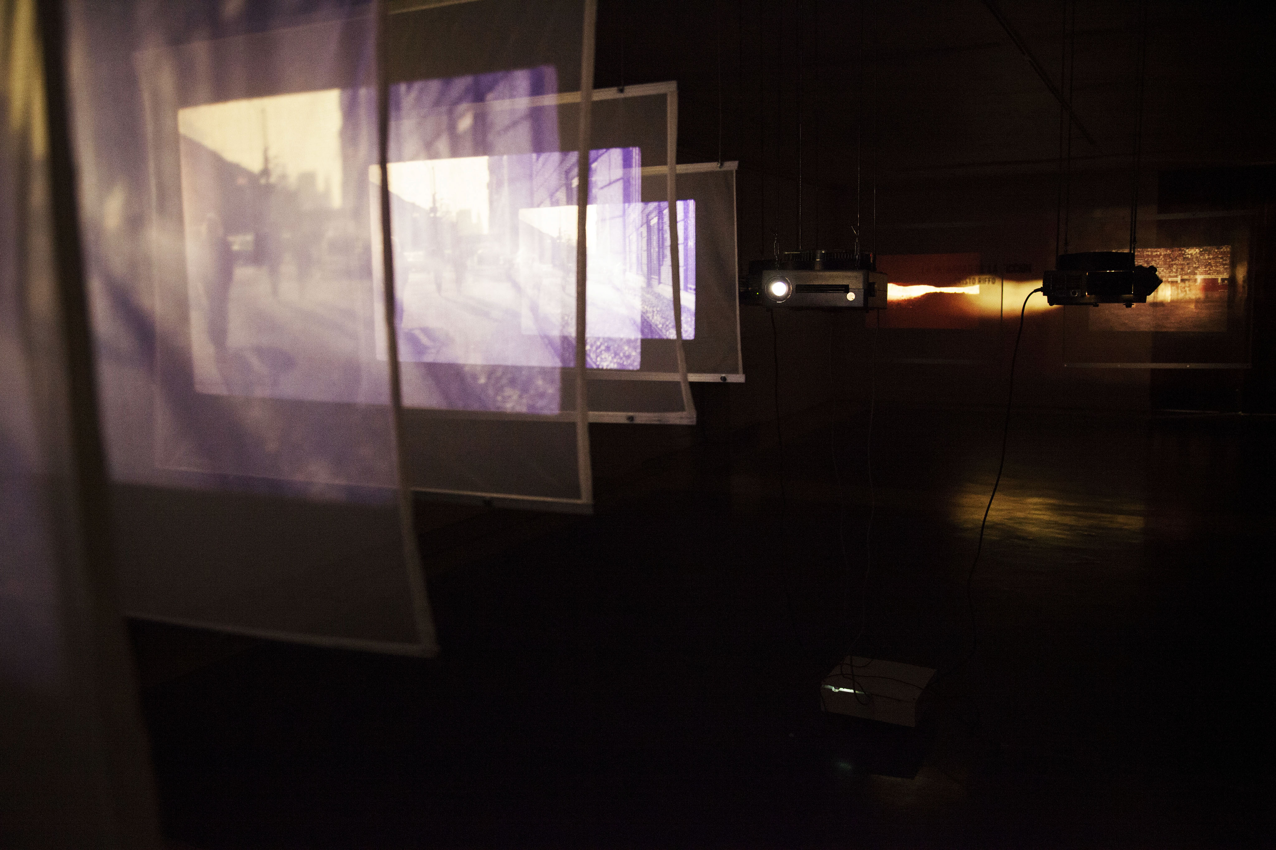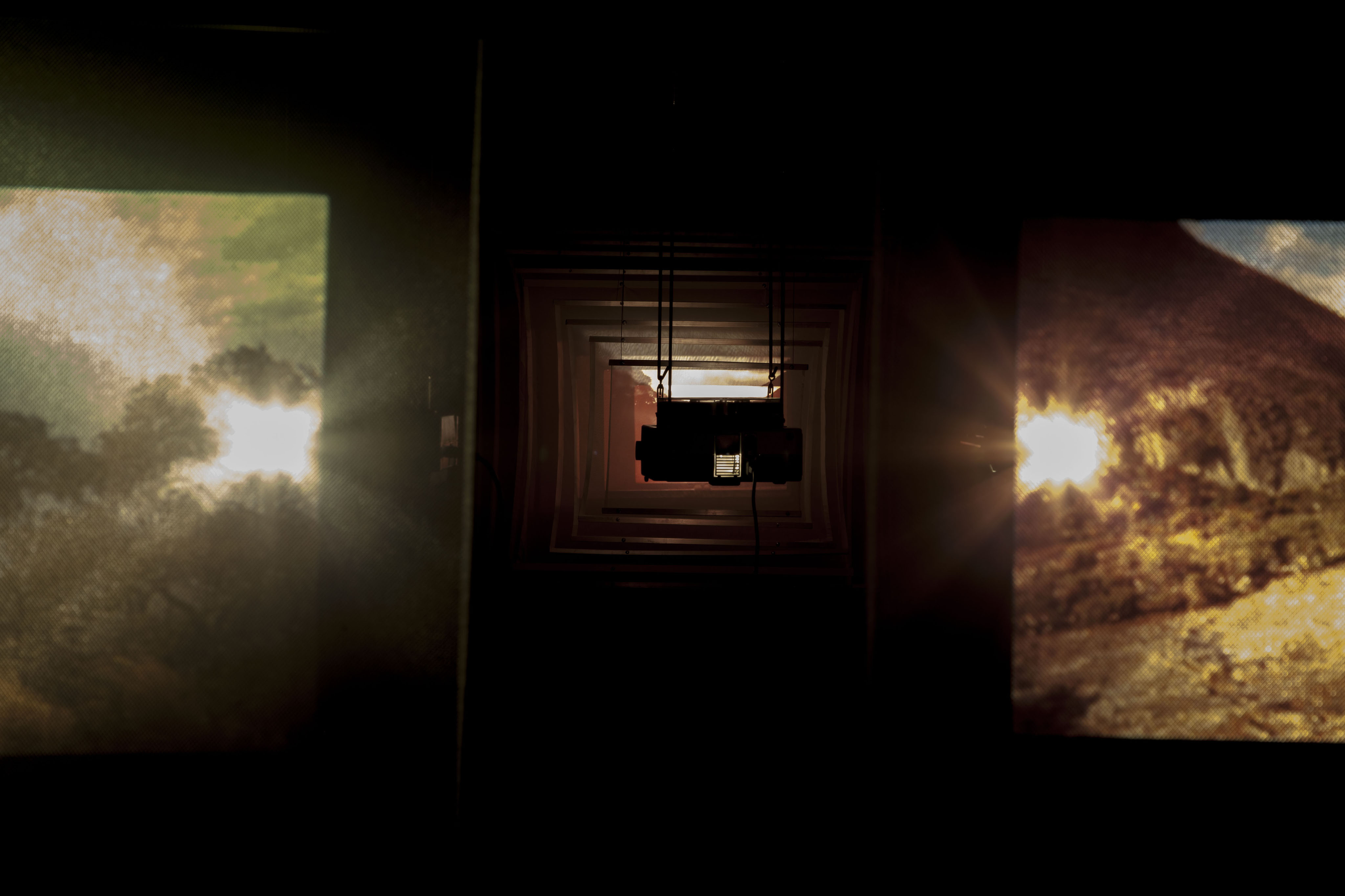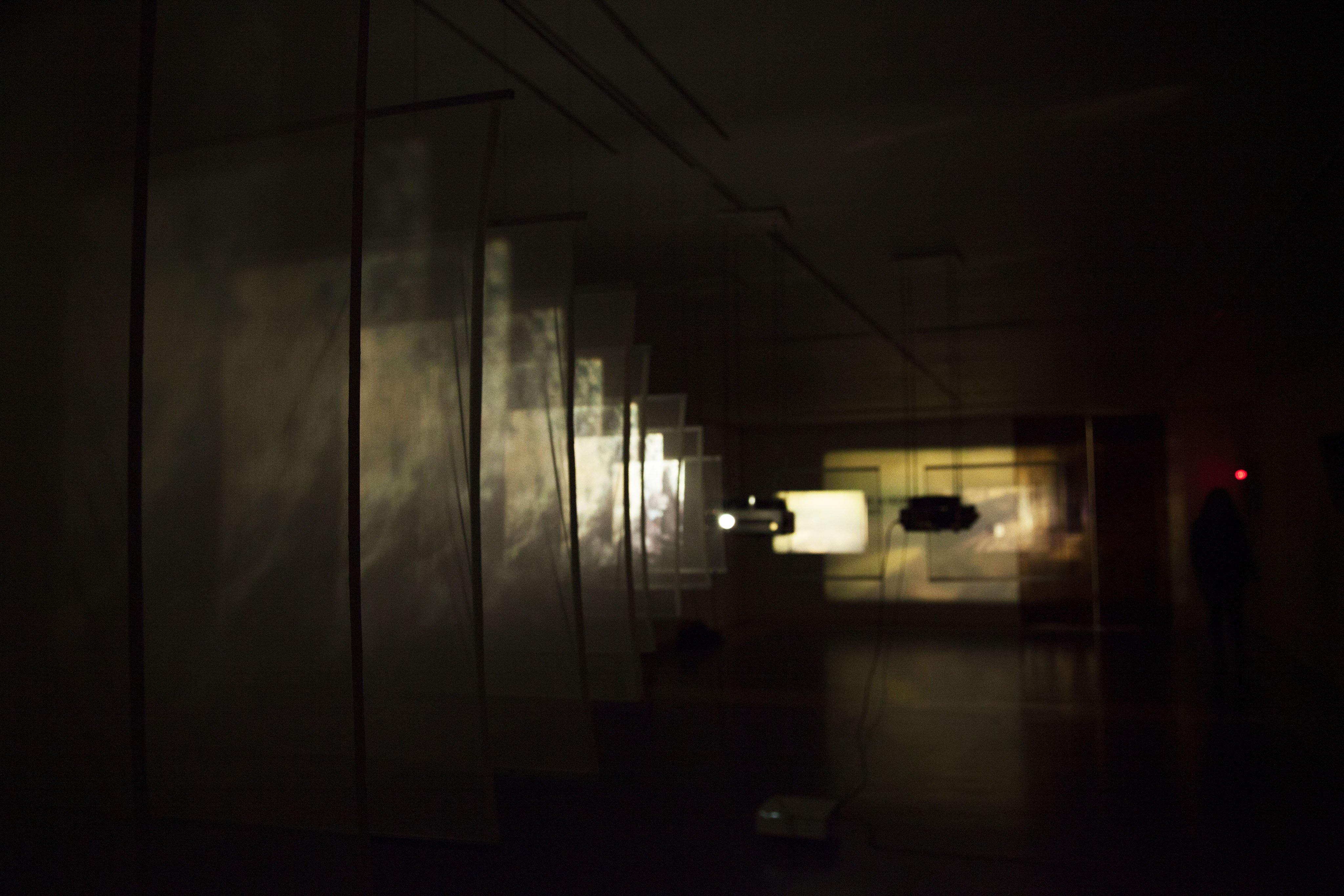 On one side of the installation, one of the projection artifacts emits a series of images that are distorted and amplified, thanks to a tunnel of superimposed semi-transparent fabrics; These are enlarged proportionally to the projection of the image, which disappears as the distance from the point of emission increases. The other two projectors face two equally translucent contiguous fabrics, which trap the image at its focal point, to let the rest of the light that bounces off the wall, defocused, producing a light game of shade and color.